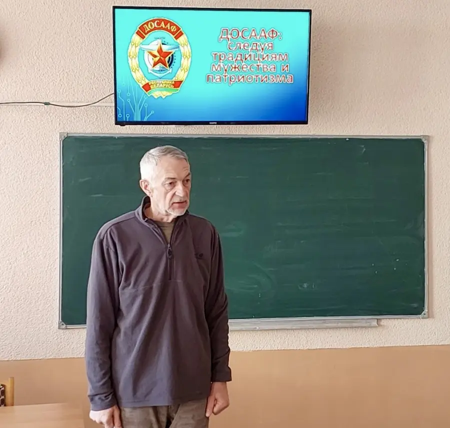 Представитель ДОСААФ Александр Миронов, прибывший в этот день в школу, рассказал о героических поступках выпускников курсов ОСОАВИАХИМ (ДОСААФ) в годы войны.